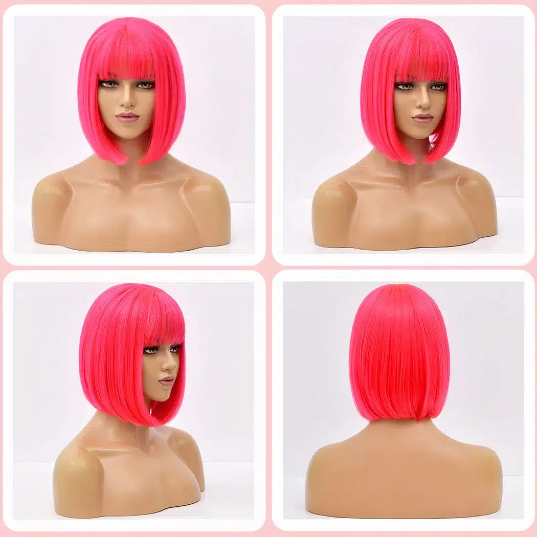 Pour un look ultra féminin, optez pour cette perruque rose bonbon coupe au carré avec frange. Les longueurs lisses et épaisses de cette perruque vous offriront un look glamour et sophistiqué en un instant. Les mèches de devant sont légèrement frangées, ce qui rehaussera votre look tout en vous donnant un air plus jeune et plus dynamique. Le rose candy couleur est surement l’une des couleurs les plus girly et les plus glamours qui soient, ce qui en fait la perruque idéale pour toutes les fashionistas et les femmes qui aiment se faire remarquer.