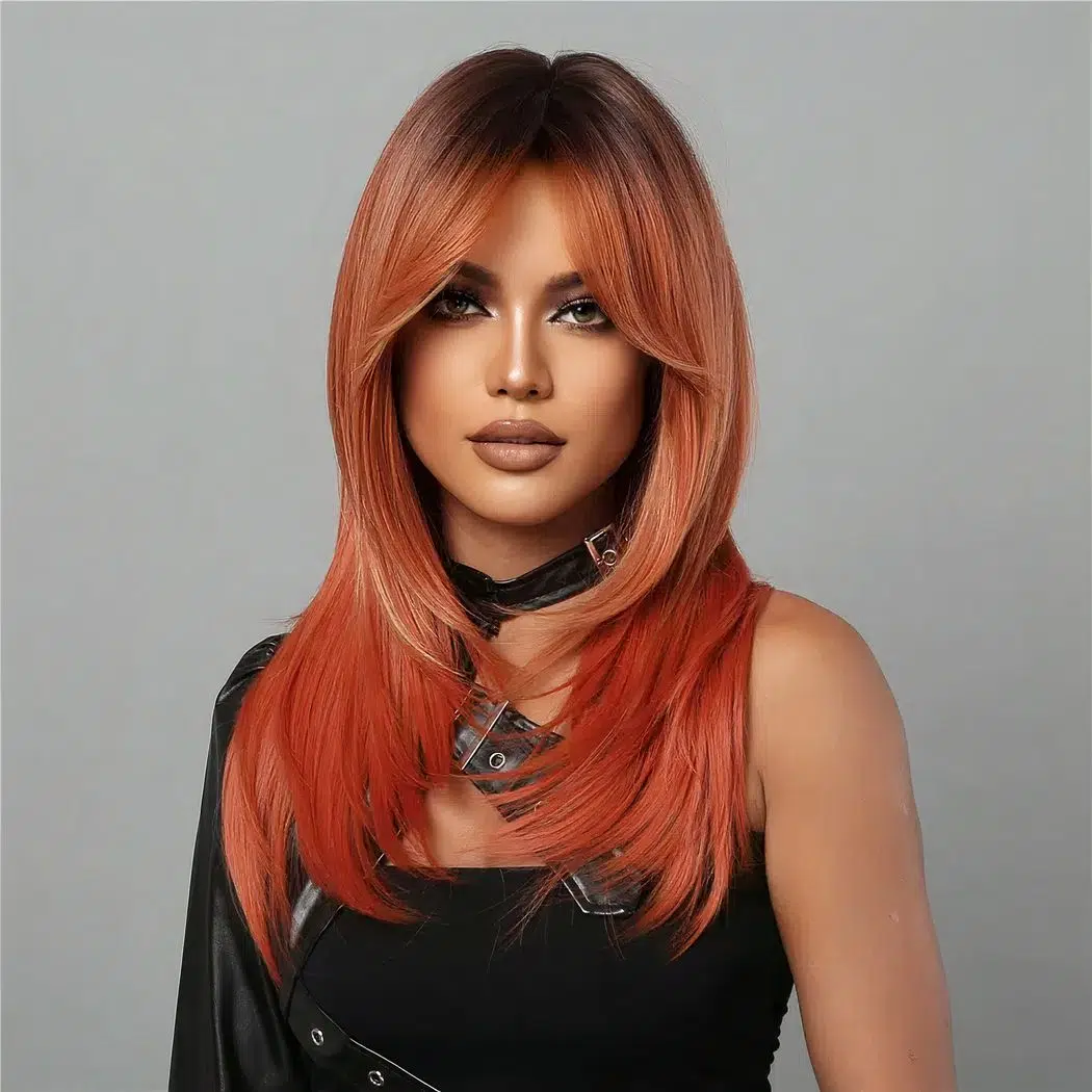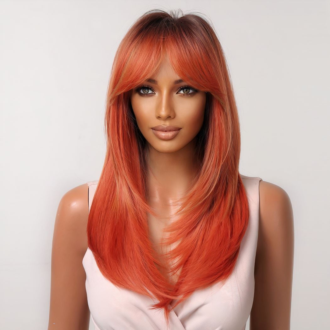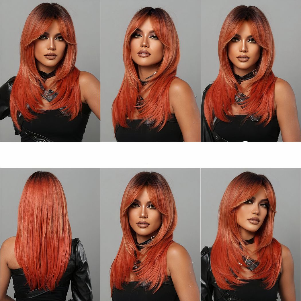 Sa longueur apporte de la prestance à votre silhouette tandis que sa couleur de feu apporte une touche glamour à votre style. Son dégradé de mèche et sa frange plongeante lui donne un look moderne et casual. Que vous recherchiez un nouveau style de tous les jours ou une façon amusante de changer de style, notre perruque est le choix parfait pour vous démarquer.